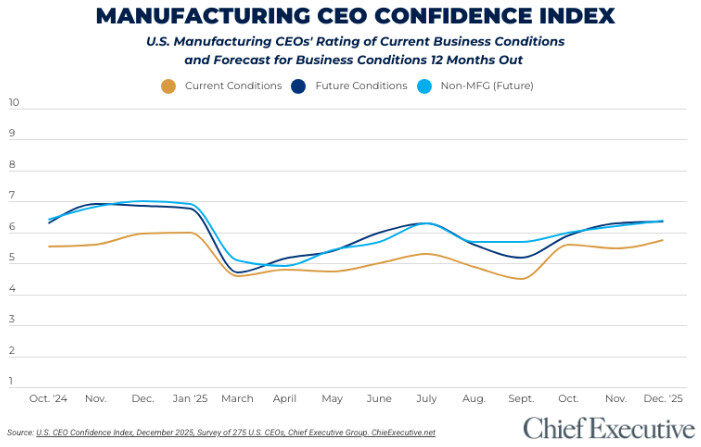 Confidence has risen for the third month in a row, and manufacturing CEOs say they are optimistic about what is to come in 2026.