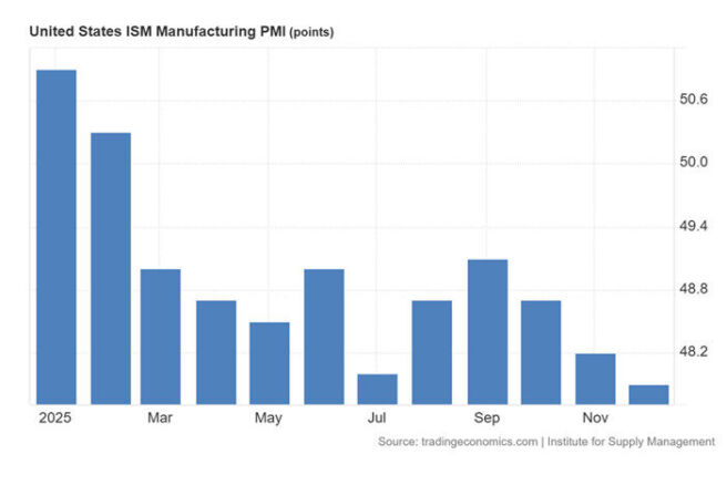 Economic activity in the manufacturing sector contracted in December for the 10th consecutive month, following a two-month expansion preceded by 26 straight months of contraction.