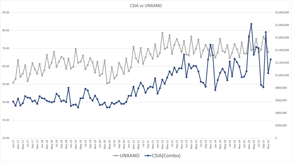We have transitioned from tracking US Capital Goods New Orders (USCGNO) to UNXANO which provides a clearer indication of actual capital spending and better aligns with the focus of most system integrators.