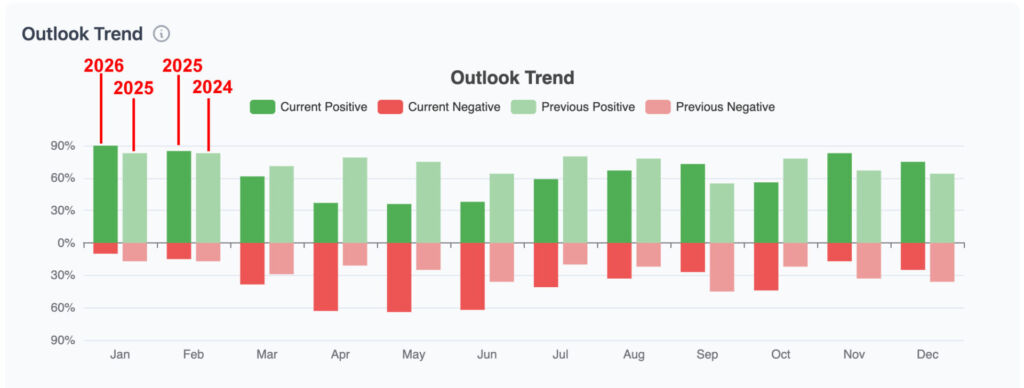 - 68% expect profits to increase, still elevated despite a modest decline from December.
