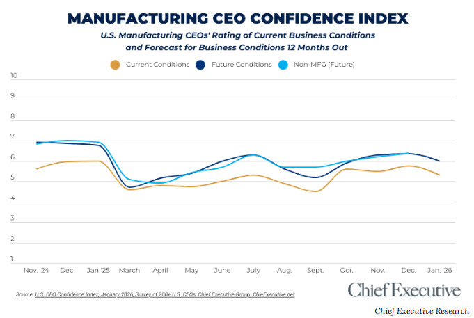 - Manufacturing CEOs rate future business conditions at 6.0 / 10, down from 6.3 in December but still roughly in line with most of 2025.