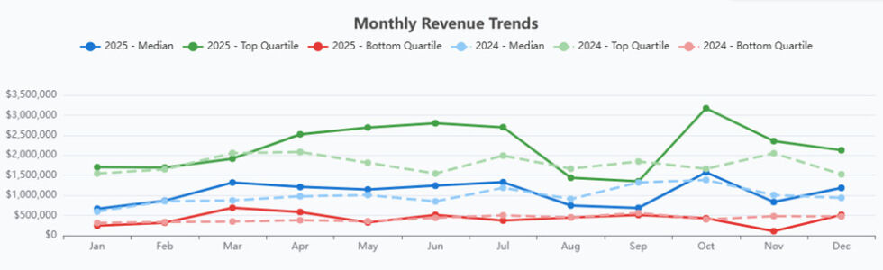December revenue rebounded across the bottom, median, and top revenue quartiles to at or above December 2024 levels, likely reflecting year-end project close-outs and revenue recognition rather than a broad acceleration in demand.