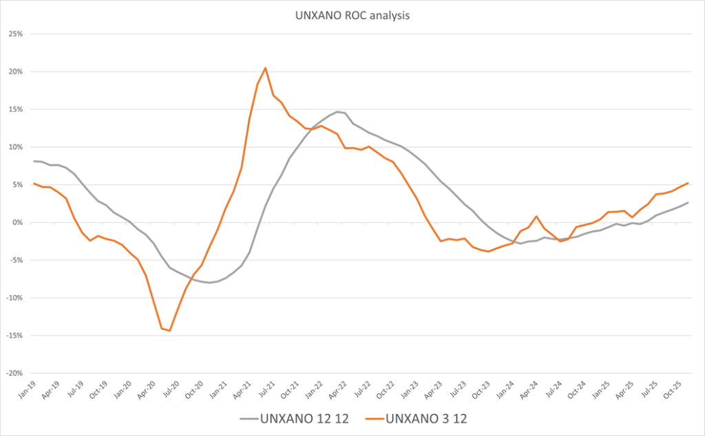 - Capital Spending Recovery: Both 3/12 and 12/12 rates of change remained positive in 2025, reflecting renewed momentum in new orders.